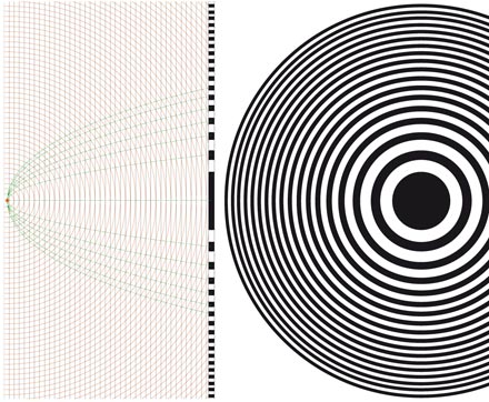 Zwei ebene Wellenfronten (Objekt- und Referenzwelle) interferieren zu einem Gitter, dessen Abstand ("Ortsfrequenz) vom Einfallwinkel zwischen den Wellenfronten abhängig ist. Ein größerer Winkel erzeugt ein engeres Gitter = höhere Ortsfrequenz. Die Datei kann unter Nennung der Quelle als .jpg oder .svg Vektordatei herunterladen, verändert und frei verwendet werden. Hologramme werden auf lichtempfindlichen Materialien aufgezeichnet. Diese Emulsionen brauchen einen Träger. Zumeist sind es Kunststoffe, häufig aber auch Glas. Sie sind je nach Material empfindlich gegen UV-Strahlung, Feuchtigkeit und mechanische Einwirkung (Kratzer). Alternativ besteht die Möglichkeit, eine CCD Einheit (aus einer Digitalkamera) anstelle des Hologrammaufnahmenmaterials zu verwenden und das Hologramm (Interferenzmuster) digital auszuwerten. Die Auflösungsanforderung bleibt jedoch. Wird ein Hologramm mit einem Lichtstrahl unter dem richtigen Winkel (nämlich dem der zweiten Wellenfront bei der Aufnahme) beleuchtet, so gibt es die Informationen wieder frei. Wichtig ist, dass es nur eine Lichtquelle, ein Lichtpunkt ist. Eine zu nahe oder zu große Lichtquelle, z.B. eine Neonröhre, ist für die Wiedergabe (ohne Blende) ungeeignet. Halogenlampen oder die Sonne sind für die Betrachung von Weißlicht-Hologrammen sehr gut geeignet. Hologramm = FensterEin Hologramm kann am besten als virtuelles Fenster auffassen, durch das eine drei dimensionale Welt betrachten werden kann. Objekte in dieser Welt sind räumlich angeordnet und geben daher für das linke Auge des Betrachters ein anderes Bild von sich als für das rechte. Aus der Seherfahrung läßt sich mit beiden Bildern ein räumlicher Eindruck bilden. Gegenüber anderen Methoden läßt sich nun durch einfaches Bewegen des Kopfes an den Objekte vorbeischauen. Jede kleine Fläche eines Hologramms speichert die gesamte räumliche Information. Ist ein Objekt gut ausgeleuchtet (kommt von jeder Stelle des Objekt an jede Stelle des Hologramms Licht), so steckt die Information über das Objekt an jeder Stelle des Hologramms. (Man kann dieses durch eine Milchglasscheibe bei der Beleuchtung des Objekts während der Aufnahme fördern.) Teil man anschließend das fertige Hologramm, so verkleinert sich zwar das Fenster, aber wenn man den Kopf mehr bewegt, sieht man weiterhin das ganze Objekt. Aus diesem Grund bedeuten Kratzer auf einem Hologramm auch deutlich weniger Informationsverlust als auf einem Foto. Das Zerschneiden eines Hologramms ist somit gleichbedeutend mit dem Verkleinern des Fensters und der größeren Bewegung des Kopfes, um alle Objekte zu sehen. Das einfachste HologrammDas Hologramm eines einzigen Lichtpunkts kann man als das einfachste Hologramm bezeichnen. Es ist das Intererenzmuster einer ebenen Wellenfront (Referenzstrahl) mit einer Kugelwelle (Objektstrahl): eine Fresnelschen Zohnenplatte. In der Mitte ein dunkler Kreis, der abwechselnd von hellen und dunklen Ringen umkreist ist. Dabei bleiben die Flächen des Kreises und der Ringe immer gleich groß. Ein Hologramm, das aus einer ebenen Welle (Referenz) eine kugelförmige Welle (Objekt) macht, verhält sich wie eine Linse.